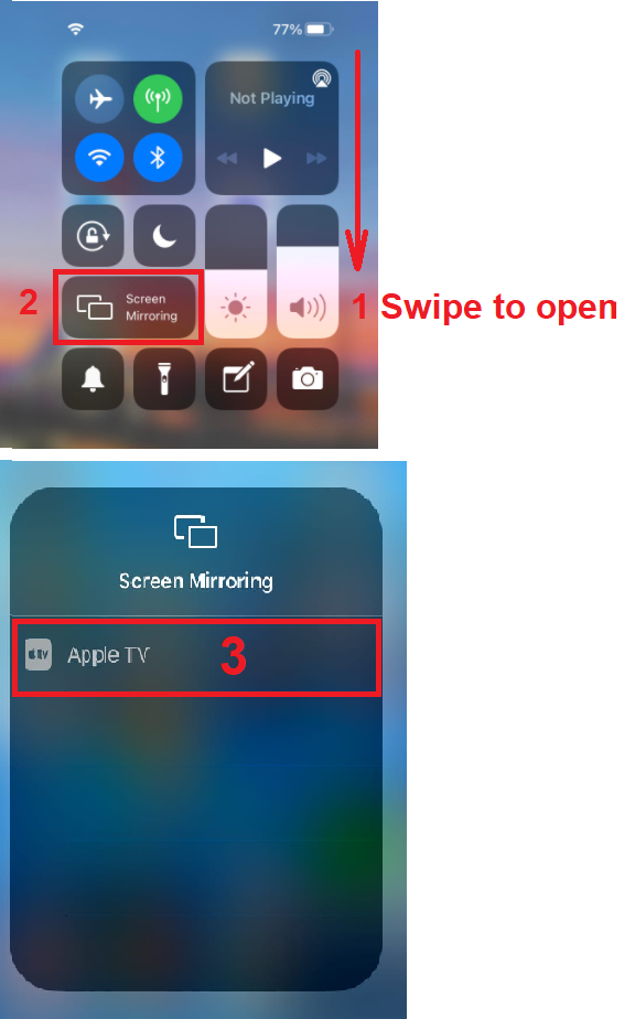 6. Swiping from the top right corner of the mobile device screen opens the iOS Control Centre menu and clicking on the Screen Mirroring icon;