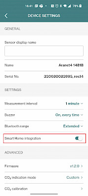 Before starting to use integration, please configure the Aranet4 device using the Aranet Home App - enable Smart Home Integration in the Aranet Home App device settings